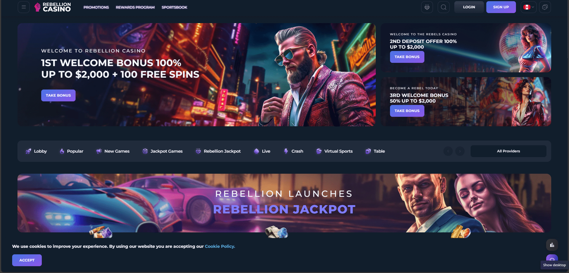 With games from top software providers, Rebellion Casino has a huge selection. Numerous slots, crash games, and table games are available to play in both virtual and live environments. Numerous variations of Blackjack, Poker, and Roulette exist, along with well-known game shows. On major and minor international and local sports events, the website also provides a plethora of pre-match and in-play markets. Furthermore, virtual and Esports betting is available.