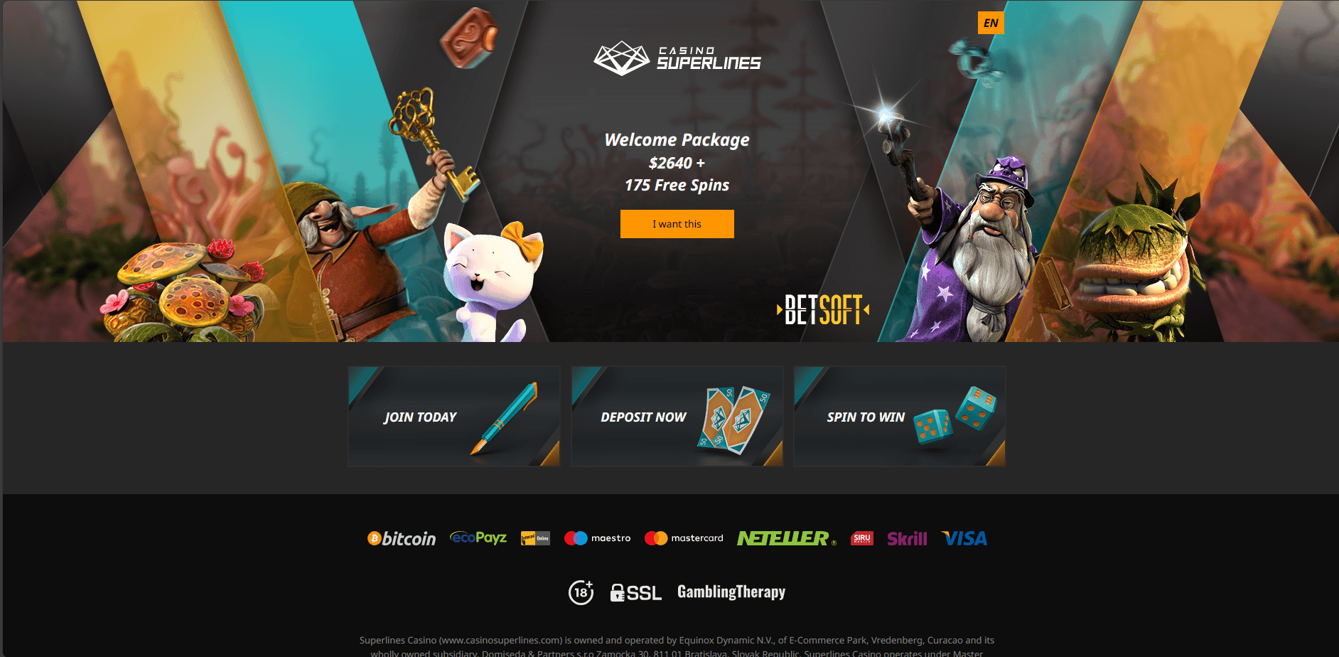Online casino Casino Superlines provides instant-play gaming featuring casino games and video slots from top software providers. Among them are numerous software behemoths such as NetEnt, NextGen Gaming, Lightning Box, GameArt, Amaya, Elk Studios, Thunderkick, and 1x2 Gaming. There are ten languages available for the casino, including English, Spanish, French, and German. Equinox Dynamic N.V. is the owner of Casino Superlines, which is authorized and overseen by the Curaçaoan government.