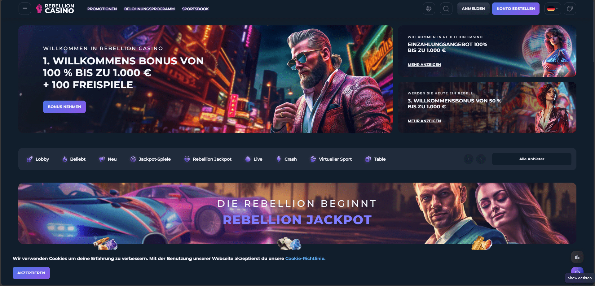 Rebellion Casino ist das neueste Unternehmen von Dama NV, einem renommierten Namen in der Glücksspielbranche. Der Betreiber verfügt bereits über ein großes Portfolio von über 80 Marken, von denen wir die meisten auch überprüft haben, und ist auf die Erstellung kryptowährungsfreundlicher Websites spezialisiert. Alle charakteristischen Merkmale des Unternehmens sind Eigentum des neuesten Mitglieds seiner Familie, einschließlich einer umfangreichen Auswahl an Spielen einiger der bekanntesten Anbieter der Online-Gaming-Branche, einer Vielzahl spannender Werbeaktionen und einer Vielzahl von Zahlungsmethoden für einfache Ein- und Auszahlungen. Darüber hinaus verfügt das Rebellion Casino über einen Sportwettenbereich, in dem Sie auf wichtige Fußball-, Tennis-, Basketball- und andere Sportereignisse wetten können.