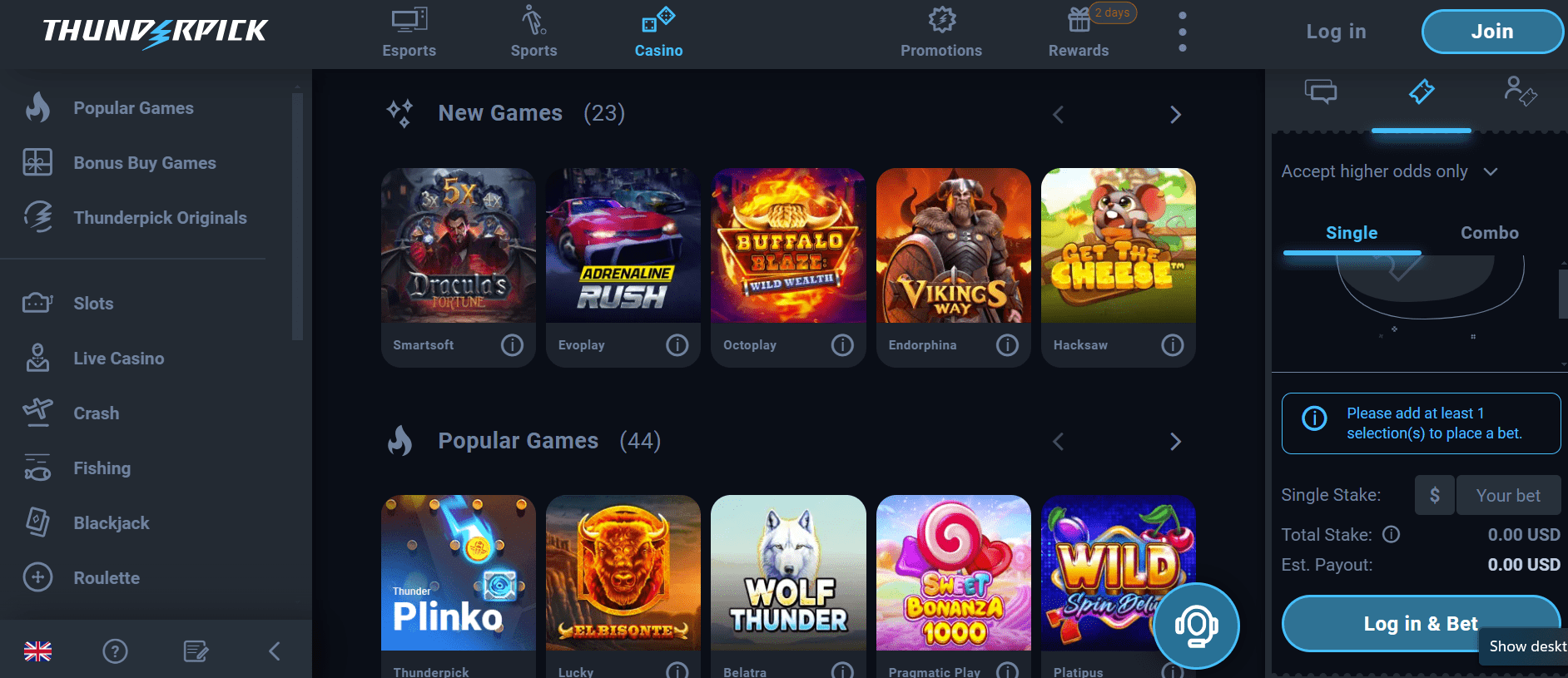 Thunderpick Casino on kryptovaluuttakasino, joka tarjoaa monia suosittuja kasinopelejä luotettavilta tarjoajilta sekä kokoelman kasinon kehitystiimin luomia eksklusiivisia pelejä. Pelaajien tulisi tunnistaa tässä luetellut tarjoajat, koska niihin kuuluu tunnettuja nimiä, kuten Relax Gaming, BGaming, Yggdrasil, Push Gaming ja Nolimit City. Pelaajat voivat valita haluamansa kielen, ja kasino on yhteensopiva sekä verkko- että mobiililaitteiden kanssa. Pelaajat voivat myös olla varmoja, sillä kasino on täysin Curaçaon hallituksen lisensoima ja valvoma.